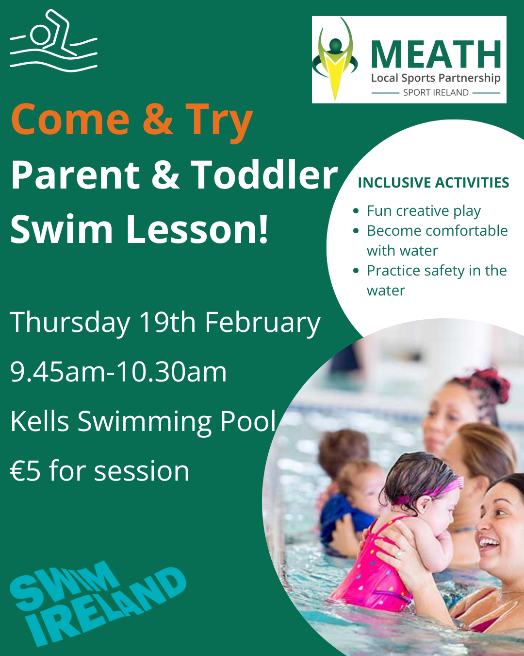 Parent & Toddler Swim – a fantastic way for parents to introduce their young children (18mth – 3.5yrs) to water in a supportive environment. The coach led taster initiative will demonstrate a variety of techniques to help your child be comfortable in the water and introduce them to an essential life skill. The taster session costs €5 and will allow you and your child to: