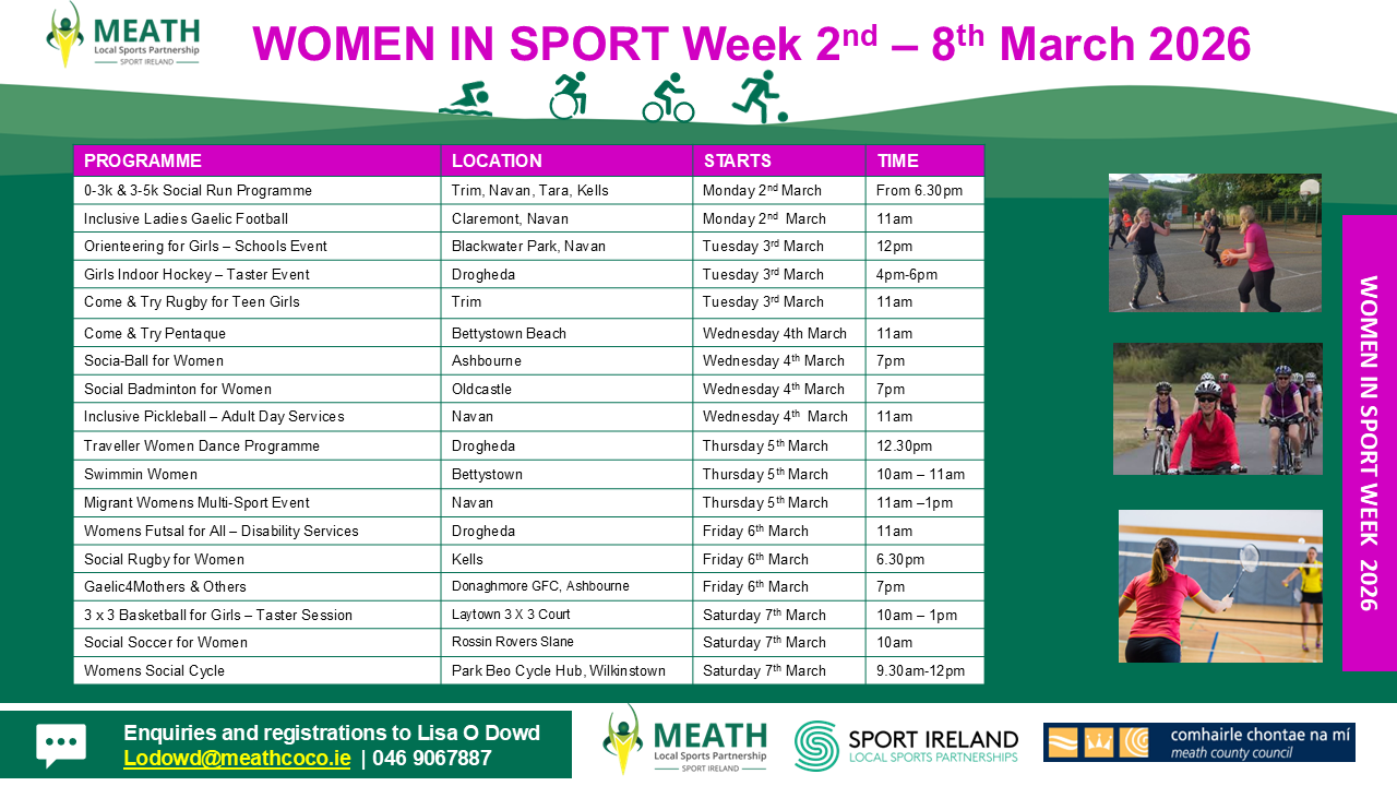Women in Sport Week 2026 will take place from Monday 2nd to Sunday 8th March, celebrating and supporting female participation in sport and physical activity across County Meath.