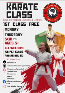 Tora Karate Club is a traditional JKF Wado-Kai karate club that focuses on Kata and Kumite while fostering fitness, respect, fun and discipline. Classes held every Monday and Thursday from ages 5+ for all abilities. Classes are held in the Church of Ireland Parish Rooms, Laytown Road, Julianstown.